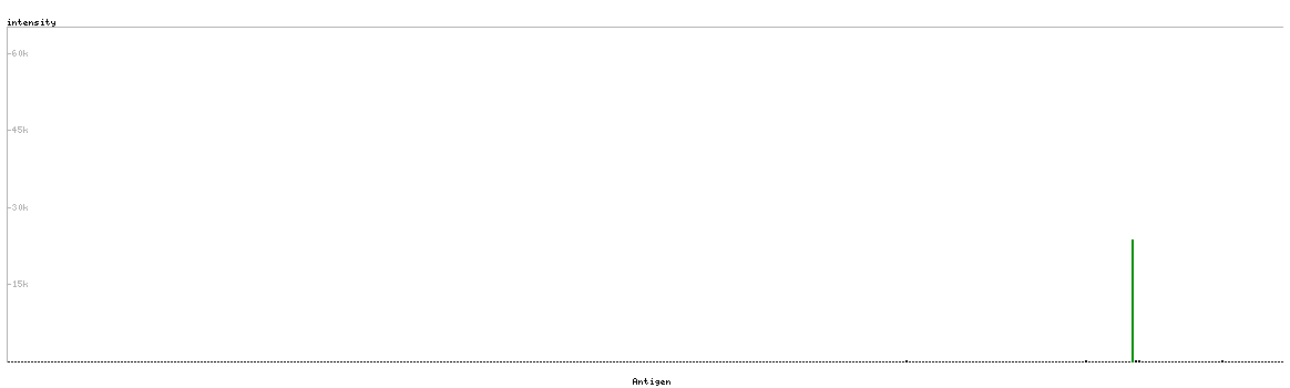 At the top of the view, the position of the antigen (identified by the corresponding HPA identifier) is shown as a green bar. A yellow triangle on the bar indicates a <100% sequence identity to the protein target.