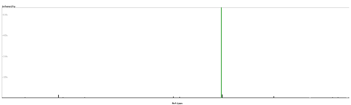At the top of the view, the position of the antigen (identified by the corresponding HPA identifier) is shown as a green bar. A yellow triangle on the bar indicates a <100% sequence identity to the protein target.
