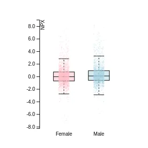 Blood protein levels in 96 healthy adults (aged 50–65) measured at six visits over a two-year period, shown separately for males and females. Relative protein abundances were quantified using the proximity extension assay (PEA) with the Olink Explore HT.