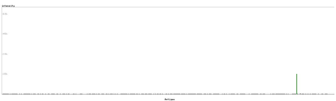 At the top of the view, the position of the antigen (identified by the corresponding HPA identifier) is shown as a green bar. A yellow triangle on the bar indicates a <100% sequence identity to the protein target.
