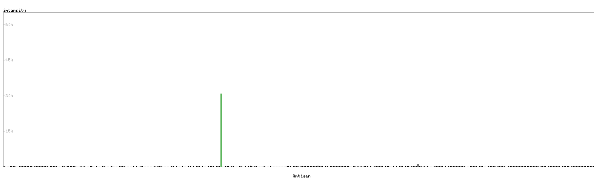 At the top of the view, the position of the antigen (identified by the corresponding HPA identifier) is shown as a green bar. A yellow triangle on the bar indicates a <100% sequence identity to the protein target.