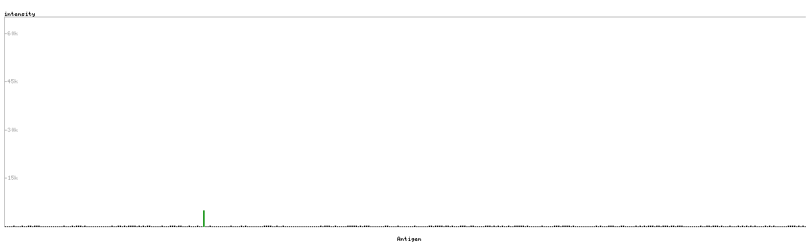 At the top of the view, the position of the antigen (identified by the corresponding HPA identifier) is shown as a green bar. A yellow triangle on the bar indicates a <100% sequence identity to the protein target.