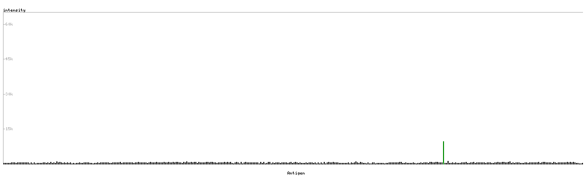 At the top of the view, the position of the antigen (identified by the corresponding HPA identifier) is shown as a green bar. A yellow triangle on the bar indicates a <100% sequence identity to the protein target.