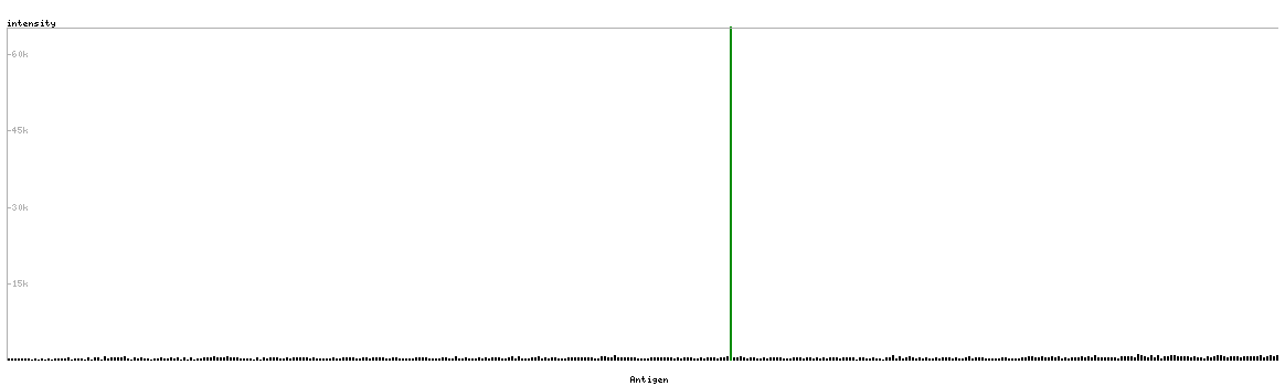 At the top of the view, the position of the antigen (identified by the corresponding HPA identifier) is shown as a green bar. A yellow triangle on the bar indicates a <100% sequence identity to the protein target.