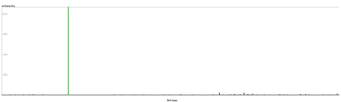 At the top of the view, the position of the antigen (identified by the corresponding HPA identifier) is shown as a green bar. A yellow triangle on the bar indicates a <100% sequence identity to the protein target.