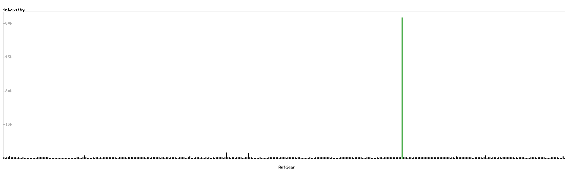 At the top of the view, the position of the antigen (identified by the corresponding HPA identifier) is shown as a green bar. A yellow triangle on the bar indicates a <100% sequence identity to the protein target.
