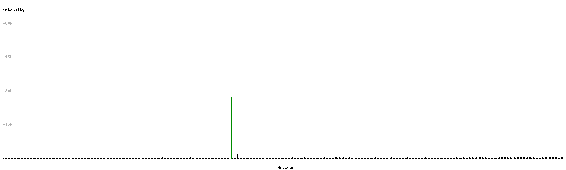 At the top of the view, the position of the antigen (identified by the corresponding HPA identifier) is shown as a green bar. A yellow triangle on the bar indicates a <100% sequence identity to the protein target.