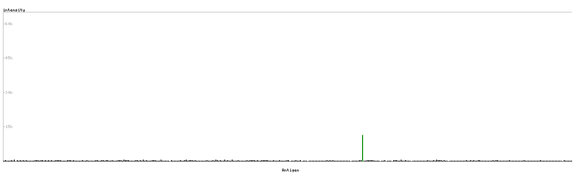 At the top of the view, the position of the antigen (identified by the corresponding HPA identifier) is shown as a green bar. A yellow triangle on the bar indicates a <100% sequence identity to the protein target.