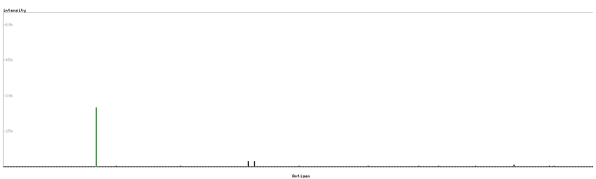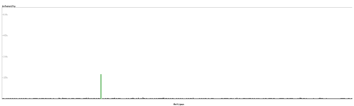At the top of the view, the position of the antigen (identified by the corresponding HPA identifier) is shown as a green bar. A yellow triangle on the bar indicates a <100% sequence identity to the protein target.