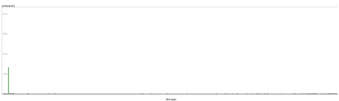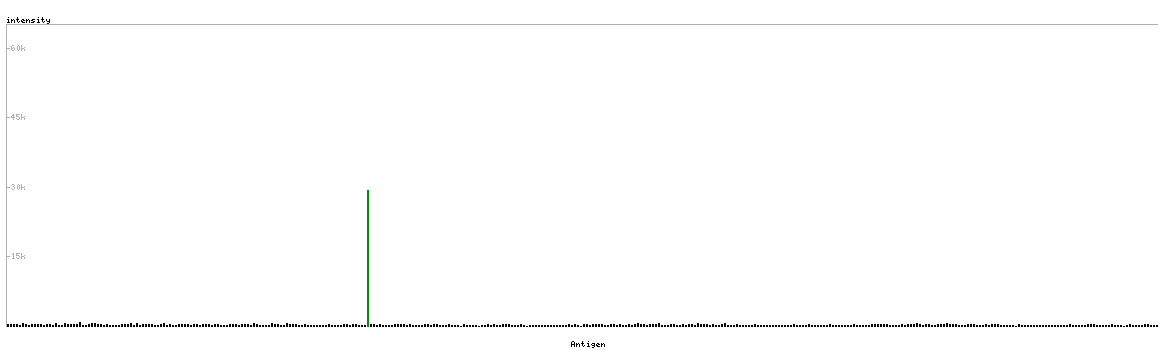 At the top of the view, the position of the antigen (identified by the corresponding HPA identifier) is shown as a green bar. A yellow triangle on the bar indicates a <100% sequence identity to the protein target.