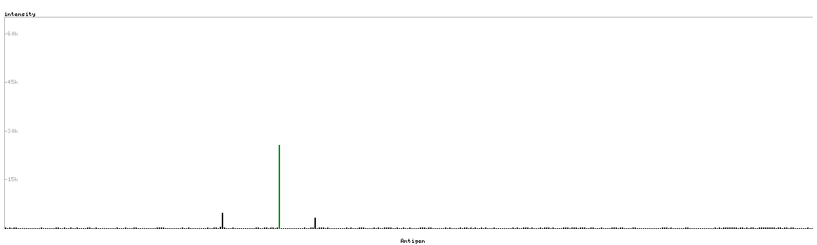 At the top of the view, the position of the antigen (identified by the corresponding HPA identifier) is shown as a green bar. A yellow triangle on the bar indicates a <100% sequence identity to the protein target.