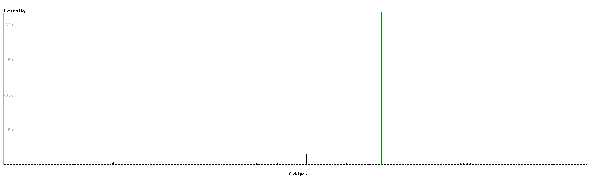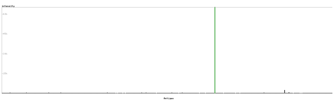 At the top of the view, the position of the antigen (identified by the corresponding HPA identifier) is shown as a green bar. A yellow triangle on the bar indicates a <100% sequence identity to the protein target.