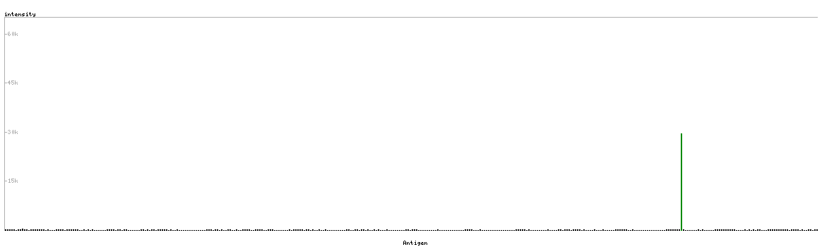 At the top of the view, the position of the antigen (identified by the corresponding HPA identifier) is shown as a green bar. A yellow triangle on the bar indicates a <100% sequence identity to the protein target.