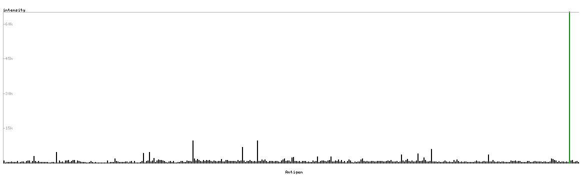 At the top of the view, the position of the antigen (identified by the corresponding HPA identifier) is shown as a green bar. A yellow triangle on the bar indicates a <100% sequence identity to the protein target.