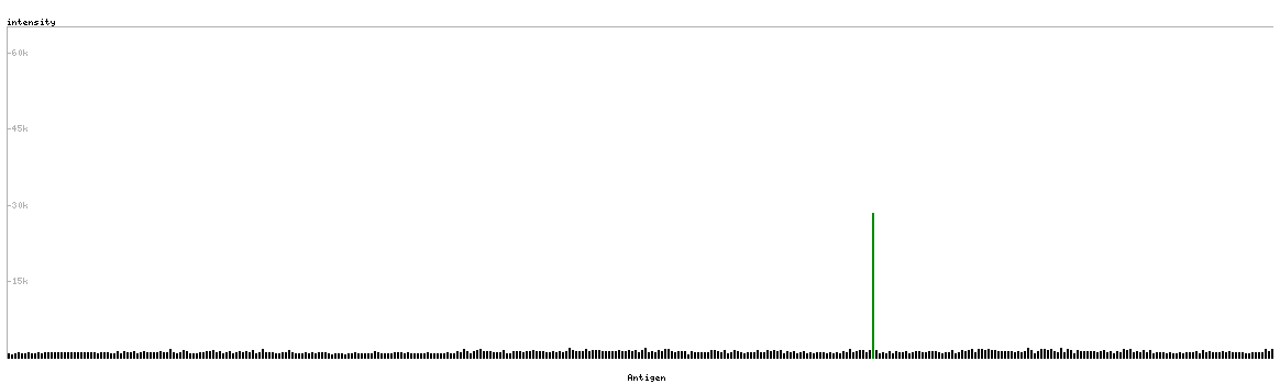 At the top of the view, the position of the antigen (identified by the corresponding HPA identifier) is shown as a green bar. A yellow triangle on the bar indicates a <100% sequence identity to the protein target.