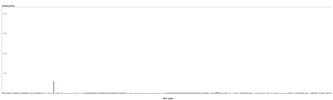 At the top of the view, the position of the antigen (identified by the corresponding HPA identifier) is shown as a green bar. A yellow triangle on the bar indicates a <100% sequence identity to the protein target.
