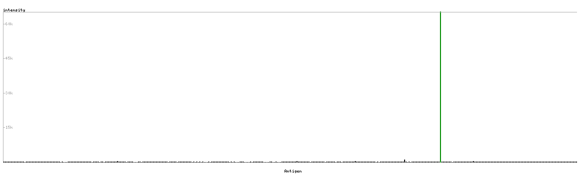 At the top of the view, the position of the antigen (identified by the corresponding HPA identifier) is shown as a green bar. A yellow triangle on the bar indicates a <100% sequence identity to the protein target.