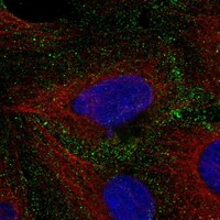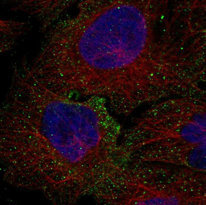 Immunofluorescent staining of human cell line U2OS shows localization to vesicles.