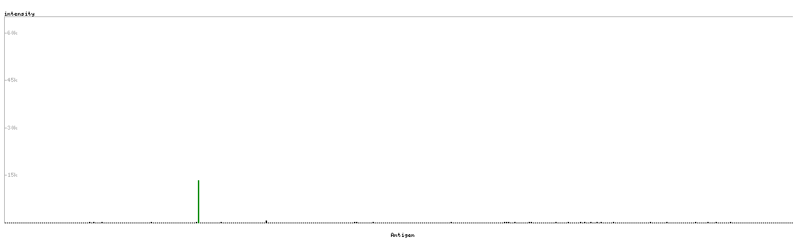 At the top of the view, the position of the antigen (identified by the corresponding HPA identifier) is shown as a green bar. A yellow triangle on the bar indicates a <100% sequence identity to the protein target.