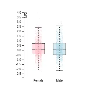 Blood protein levels in 96 healthy adults (aged 50–65) measured at six visits over a two-year period, shown separately for males and females. Relative protein abundances were quantified using the proximity extension assay (PEA) with the Olink Explore HT.