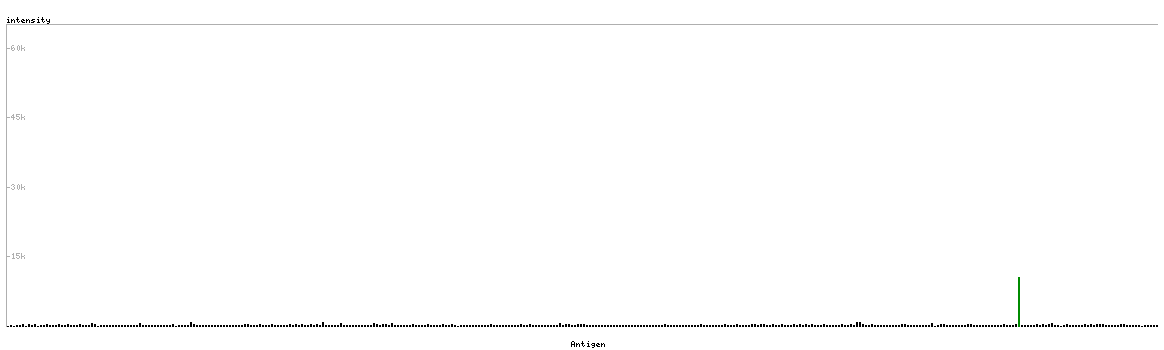 At the top of the view, the position of the antigen (identified by the corresponding HPA identifier) is shown as a green bar. A yellow triangle on the bar indicates a <100% sequence identity to the protein target.