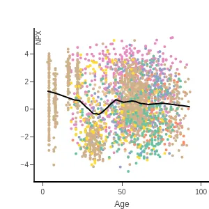 Blood protein levels by age, BMI, and sex, measured using the proximity extension assay (PEA) with the Olink Explore 1536. In the age and sex scatterplots, samples are colored by disease class.