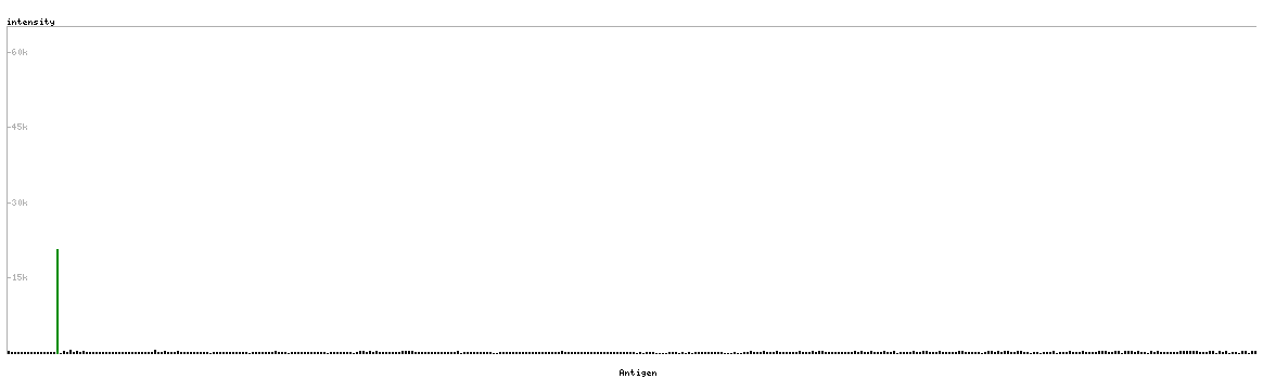 At the top of the view, the position of the antigen (identified by the corresponding HPA identifier) is shown as a green bar. A yellow triangle on the bar indicates a <100% sequence identity to the protein target.