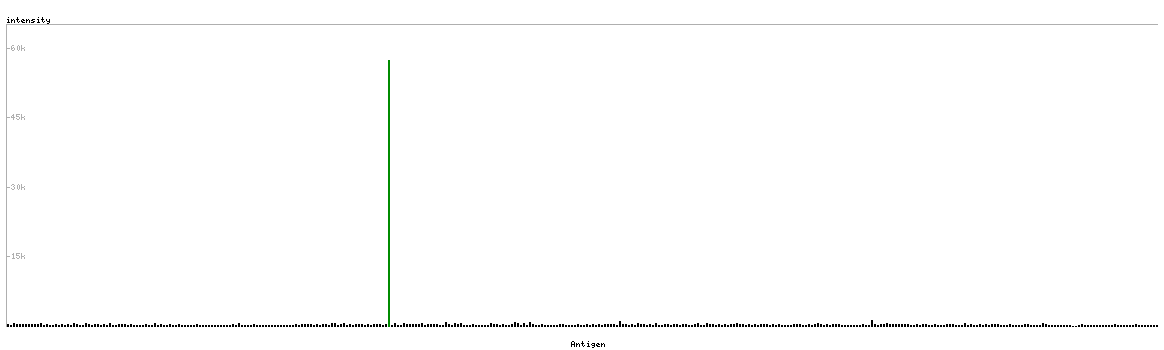 At the top of the view, the position of the antigen (identified by the corresponding HPA identifier) is shown as a green bar. A yellow triangle on the bar indicates a <100% sequence identity to the protein target.