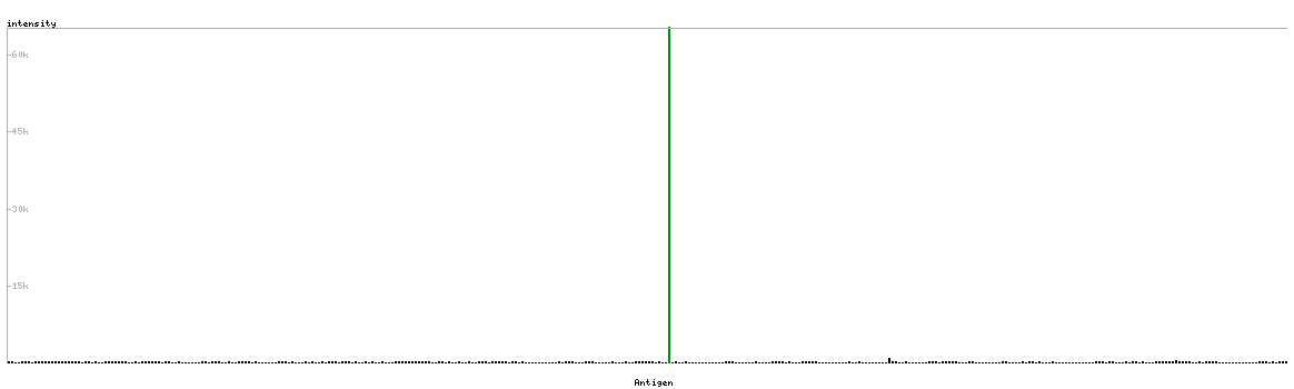 At the top of the view, the position of the antigen (identified by the corresponding HPA identifier) is shown as a green bar. A yellow triangle on the bar indicates a <100% sequence identity to the protein target.