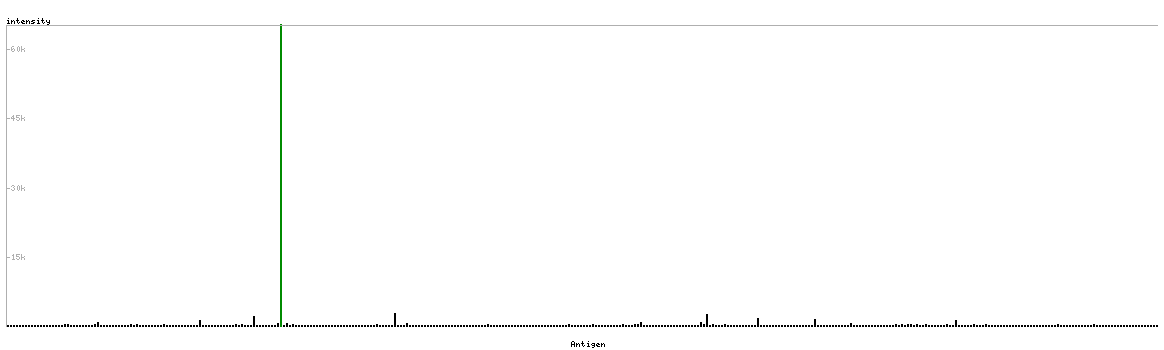At the top of the view, the position of the antigen (identified by the corresponding HPA identifier) is shown as a green bar. A yellow triangle on the bar indicates a <100% sequence identity to the protein target.