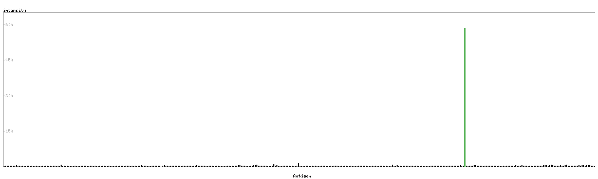 At the top of the view, the position of the antigen (identified by the corresponding HPA identifier) is shown as a green bar. A yellow triangle on the bar indicates a <100% sequence identity to the protein target.