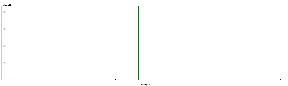 At the top of the view, the position of the antigen (identified by the corresponding HPA identifier) is shown as a green bar. A yellow triangle on the bar indicates a <100% sequence identity to the protein target.
