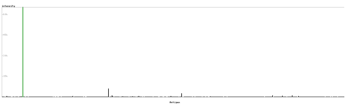 At the top of the view, the position of the antigen (identified by the corresponding HPA identifier) is shown as a green bar. A yellow triangle on the bar indicates a <100% sequence identity to the protein target.