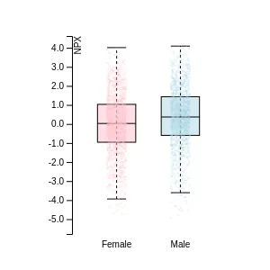A gene is classified as upregulated in a disease if the average concentration of all samples of that disease is significantly higher (adj P-value<0.005 and NPX difference>=1) than the average concentration of samples of all diseases as measured by PEA . For gender specific diseases the analysis includes only samples corresponding to the same gender from the other diseases.