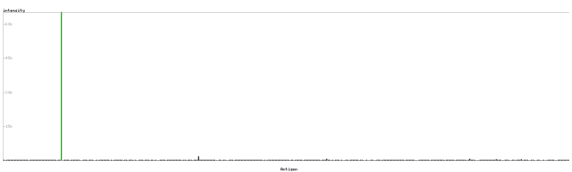 At the top of the view, the position of the antigen (identified by the corresponding HPA identifier) is shown as a green bar. A yellow triangle on the bar indicates a <100% sequence identity to the protein target.