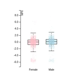Blood protein levels in 96 healthy adults (aged 50–65) measured at six visits over a two-year period, shown separately for males and females. Relative protein abundances were quantified using the proximity extension assay (PEA) with the Olink Explore HT.