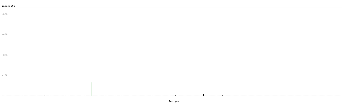At the top of the view, the position of the antigen (identified by the corresponding HPA identifier) is shown as a green bar. A yellow triangle on the bar indicates a <100% sequence identity to the protein target.