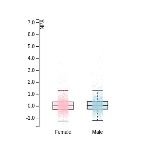 Blood protein levels in 96 healthy adults (aged 50–65) measured at six visits over a two-year period, shown separately for males and females. Relative protein abundances were quantified using the proximity extension assay (PEA) with the Olink Explore HT.