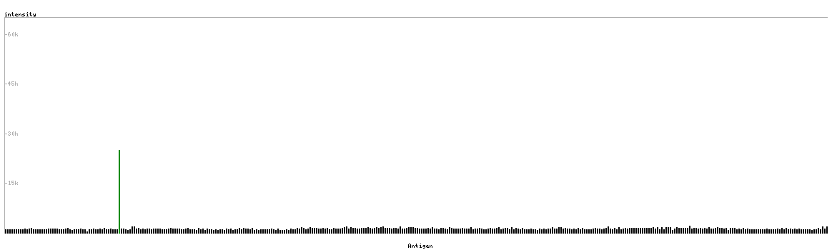 At the top of the view, the position of the antigen (identified by the corresponding HPA identifier) is shown as a green bar. A yellow triangle on the bar indicates a <100% sequence identity to the protein target.