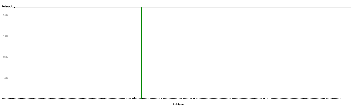 At the top of the view, the position of the antigen (identified by the corresponding HPA identifier) is shown as a green bar. A yellow triangle on the bar indicates a <100% sequence identity to the protein target.