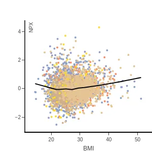 Blood protein levels by age, BMI, and sex, measured using the proximity extension assay (PEA) with the Olink Explore 1536. In the age and sex scatterplots, samples are colored by disease class.