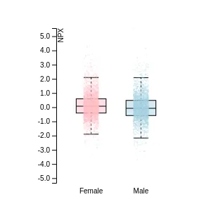 Blood protein levels in 96 healthy adults (aged 50–65) measured at six visits over a two-year period, shown separately for males and females. Relative protein abundances were quantified using the proximity extension assay (PEA) with the Olink Explore HT.