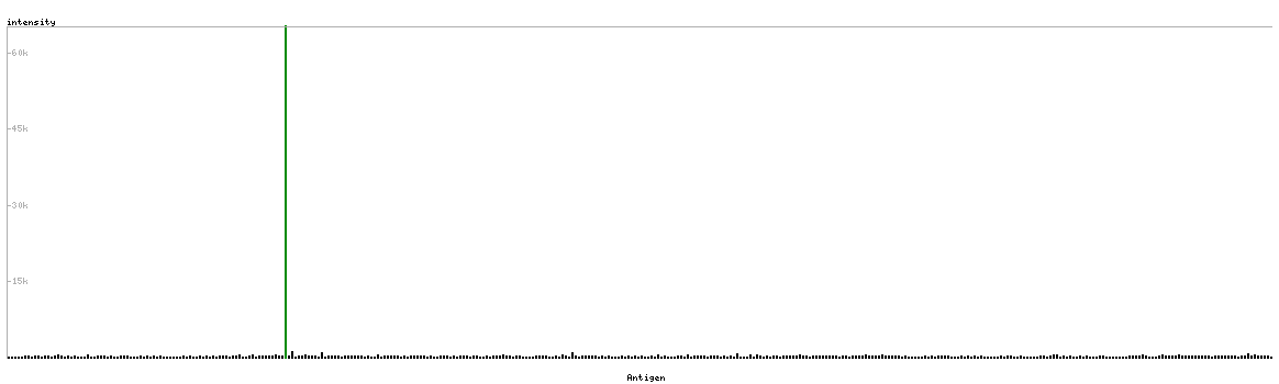 At the top of the view, the position of the antigen (identified by the corresponding HPA identifier) is shown as a green bar. A yellow triangle on the bar indicates a <100% sequence identity to the protein target.