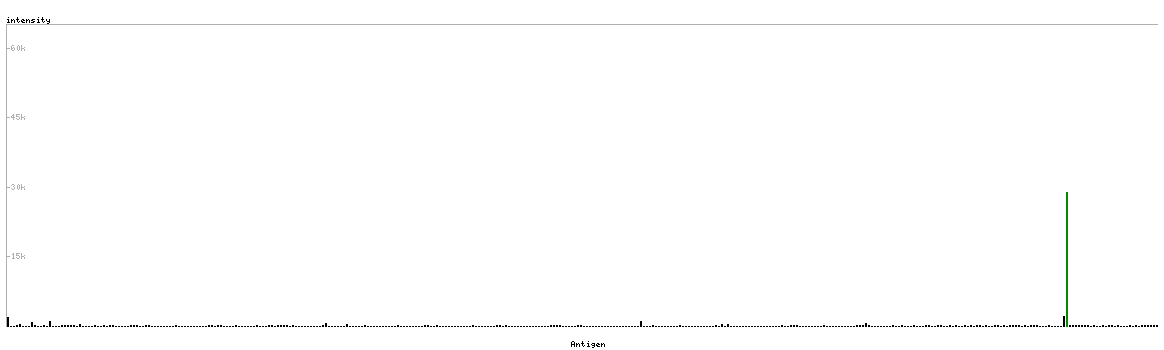 At the top of the view, the position of the antigen (identified by the corresponding HPA identifier) is shown as a green bar. A yellow triangle on the bar indicates a <100% sequence identity to the protein target.