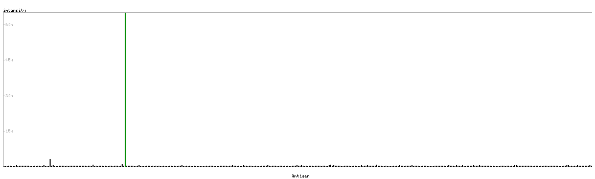 At the top of the view, the position of the antigen (identified by the corresponding HPA identifier) is shown as a green bar. A yellow triangle on the bar indicates a <100% sequence identity to the protein target.
