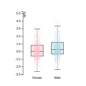 Blood protein levels in 96 healthy adults (aged 50–65) measured at six visits over a two-year period, shown separately for males and females. Relative protein abundances were quantified using the proximity extension assay (PEA) with the Olink Explore HT.