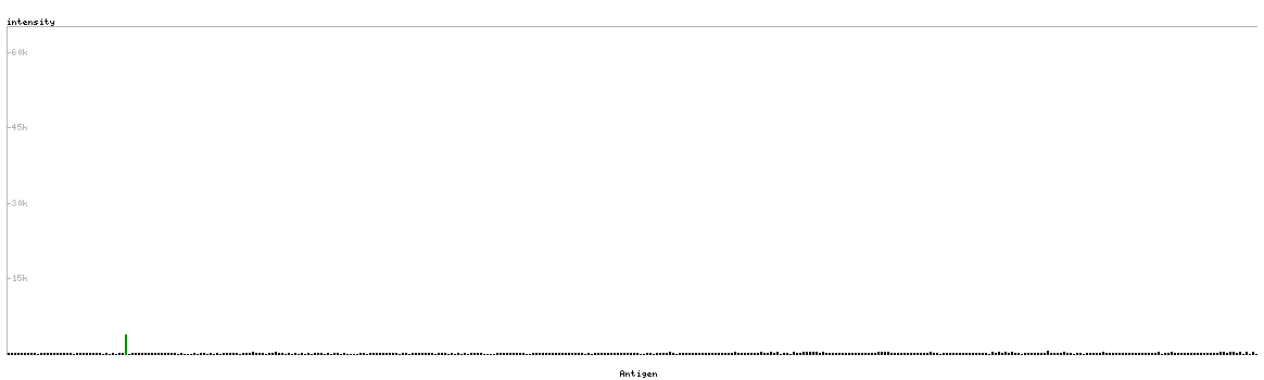 At the top of the view, the position of the antigen (identified by the corresponding HPA identifier) is shown as a green bar. A yellow triangle on the bar indicates a <100% sequence identity to the protein target.