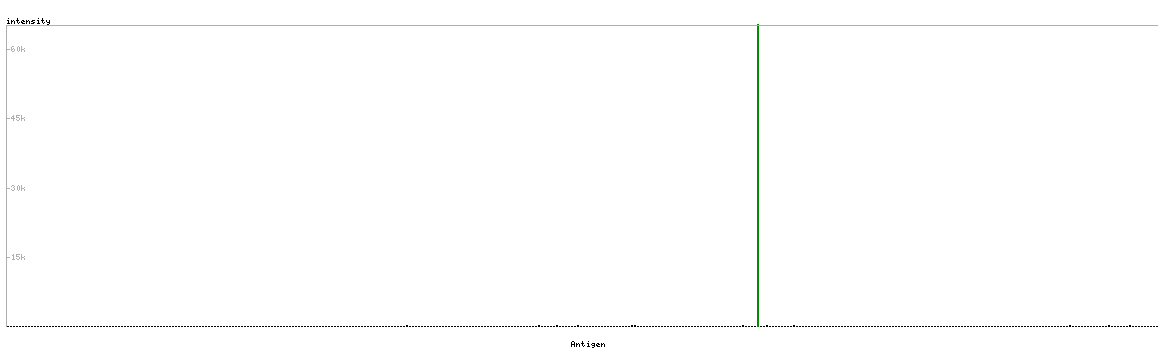 At the top of the view, the position of the antigen (identified by the corresponding HPA identifier) is shown as a green bar. A yellow triangle on the bar indicates a <100% sequence identity to the protein target.