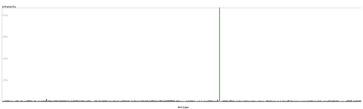 At the top of the view, the position of the antigen (identified by the corresponding HPA identifier) is shown as a green bar. A yellow triangle on the bar indicates a <100% sequence identity to the protein target.