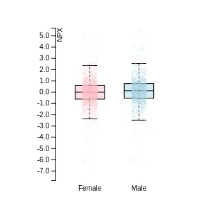 Blood protein levels in 96 healthy adults (aged 50–65) measured at six visits over a two-year period, shown separately for males and females. Relative protein abundances were quantified using the proximity extension assay (PEA) with the Olink Explore HT.